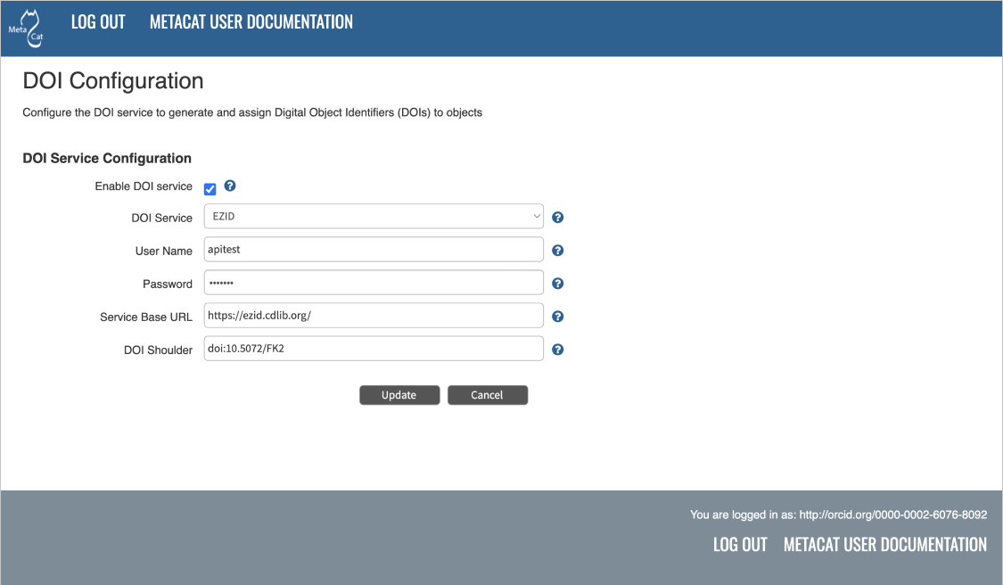 Metacat can be configured to assign Digital Object Identifiers (DOIs) to metadata/data objects through a EZID service. Click a blue question-mark icon beside any setting for detailed instructions. More information about each property is also included in the Appendix: Metacat Properties.